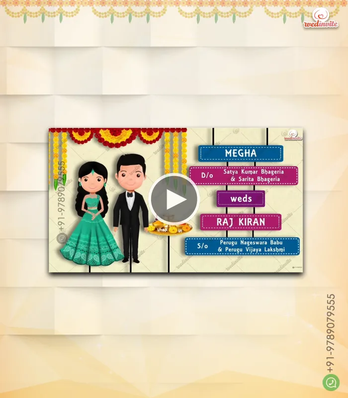 Categories: Cartoon based invitations, Gujarathi/Marwari Wedding, Hindu Wedding invitations, Jain Wedding Invitations, Karnataka tradition Invitations, Marathi wedding invitations, Rajasthani wedding invitations, Save the date invitations, South Indian Video Invitation, Tamil Brahmin Invitations, Tamil tradition Invitations, Telugu Tradition Invitations, Traditional wedding invitations
