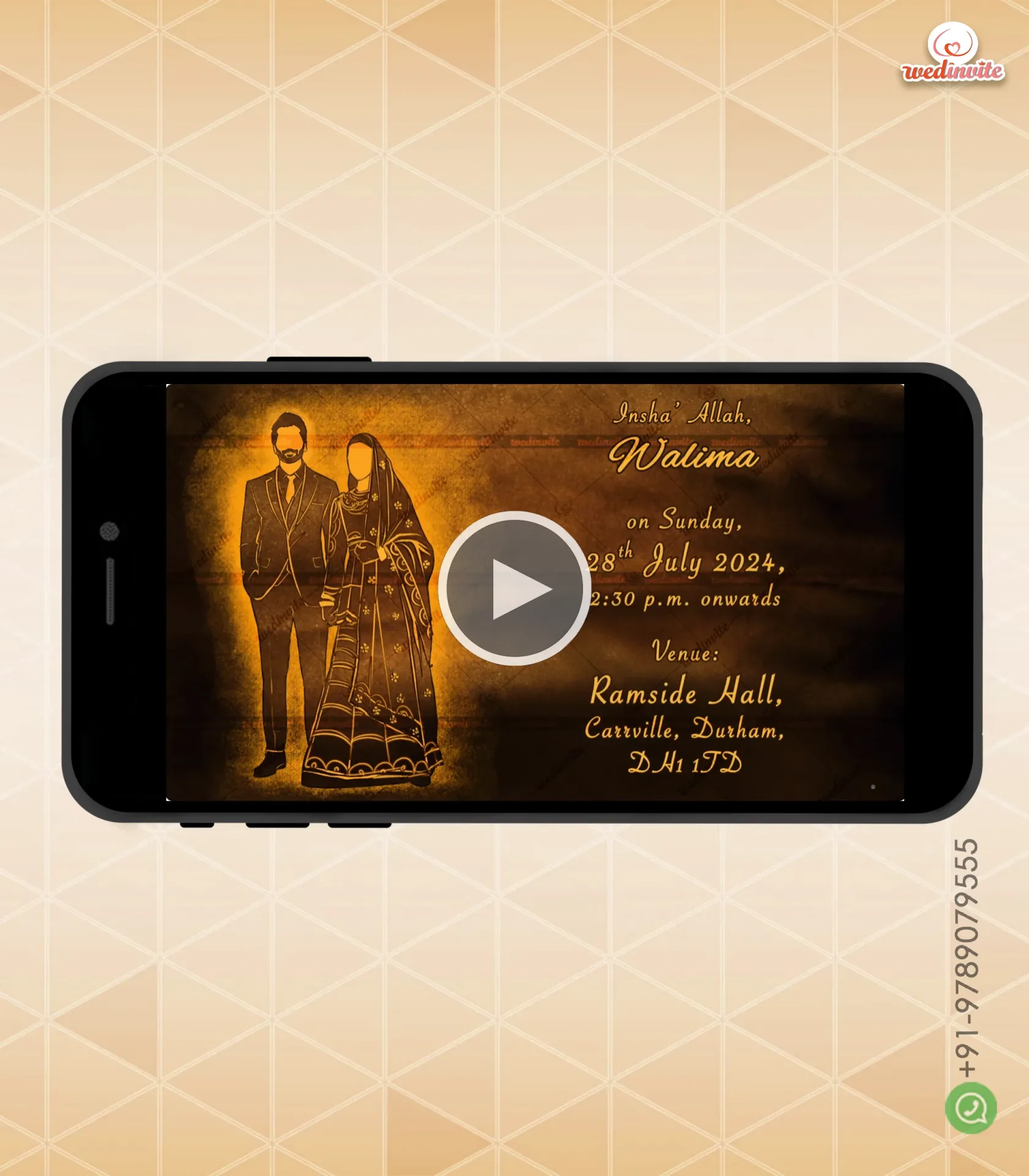 All videos include a small WedInvite logo and faded contact info on the last frame.