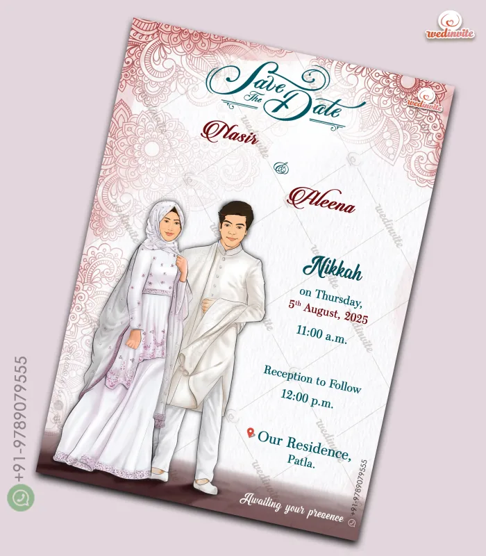 Introducing the caricature Islamic Wedding Card, a perfect blend of tradition and technology for your special day. This elegant digital wedding invitation captures the beauty of a Nikah ceremony. The Islamic wedding invite features stunning designs and heartfelt details.
